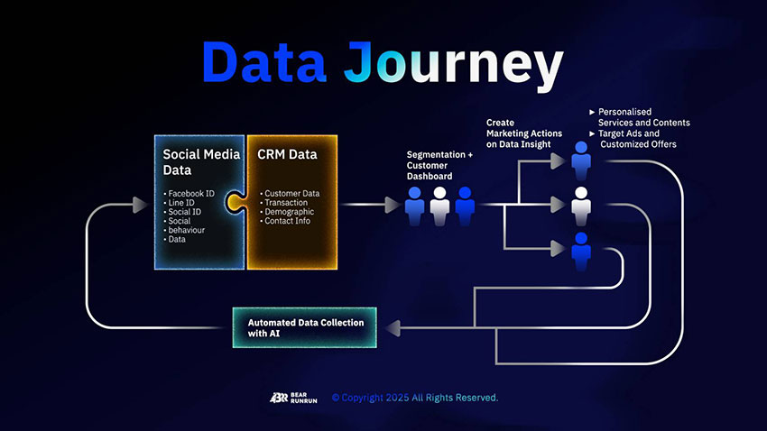 คุณจตุพร กลีบแก้ว Chief Technology Officer (CTO) BEARRUNRUN เล่าจากประสบการณ์ที่ได้ร่วมงานกับนักการตลาดหลากหลายองค์กรว่า ปัญหาสำคัญที่หลายคนเผชิญคือ ‘เวลา’ ที่เสียไปกับการรวบรวมข้อมูลที่กระจัดกระจายและยังต้องพึ่งพา manual process เป็นหลัก "การนำเทคโนโลยีและ AI เข้ามาเปลี่ยน ‘ข้อมูลกระจัดกระจาย’ ให้กลายเป็น ‘ความเข้าใจแบบเรียลไทม์’ คือจุดเปลี่ยนสำคัญ นักการตลาดสามารถออกแบบรายงานหรือแดชบอร์ดในมุมมองที่ต้องการ เห็น Insight ได้ทันที และตัดสินใจได้แม่นยำบนพื้นฐานของข้อมูลจริง"