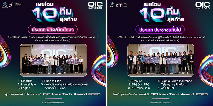 ในโอกาสนี้ สำนักงาน คปภ. ได้คัดเลือกผู้เข้าแข่งขันทั้งหมดจากมากกว่า 400 ทีม ผ่านการคัดเลือกกันอย่างเข้มจากคณะกรรมการผู้ทรงคุณวุฒิ และมีการปรับไอเดียจากคำแนะนำของที่ปรึกษาเฉพาะด้านพร้อมทั้งการนำเสนองานจริงแบบมืออาชีพ จนได้ 10 ทีมสุดท้าย เพื่อเป็นตัวแทนการแข่งขันบนเวทีประดับประเทศ OIC InsurTech Award 2025 (Finalists) แบ่งเป็น 2 ประเภท ได้แก่ ประเภท นิสิต/นักศีกษา ภายใต้โจทย์การแข่งขัน “ผสานนวัตกรรมเพื่อส่งเสริมความรู้ และความตระหนักเกี่ยวกับประกันภัย” (Innovation for Insurance Literacy) และประเภท ประชาชนทั่วไป ภายใต้โจทย์การแข่งขัน “สร้างสรรค์นวัตกรรมปฏิวัติการประกันภัยให้เข้าถึงง่าย สะดวก และรวดเร็ว” (Innovation for Accessible Insurance)