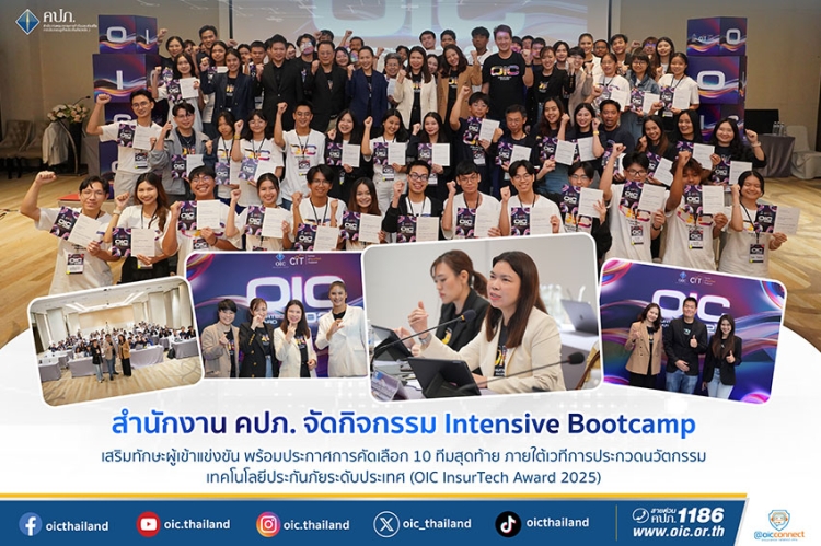 สำนักงานคณะกรรมการกำกับและส่งเสริมการประกอบธุรกิจประกันภัย (สำนักงาน คปภ.) ได้จัดกิจกรรม Intensive Bootcamp ภายใต้โครงการ “OIC InsurTech Award 2025” ระหว่างวันที่ 16 - 17 สิงหาคม 2568 เพื่อเสริมศักยภาพและยกระดับผลงานของผู้เข้าแข่งขัน ด้วยการถ่ายทอดองค์ความรู้และประสบการณ์จากผู้เชี่ยวชาญในหลากหลายด้าน เช่น การถ่ายทอดเทคนิคการสร้างต้นแบบ (Prototype) และกลยุทธ์การต่อยอดจากต้นแบบสู่ผลิตภัณฑ์และบริการที่พร้อมออกสู่ตลาด พร้อมแนะนำเทคนิคการนำเสนอ (Pitching) อย่างมืออาชีพ เพื่อสร้างความประทับใจแก่คณะกรรมการในรอบชิงชนะเลิศ