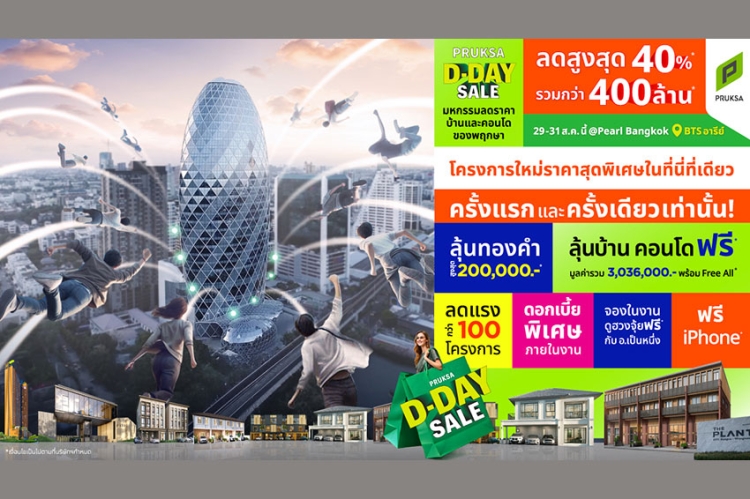 ดีลสุดคุ้มแบบนี้มีเฉพาะที่งาน PRUKSA D-DAY SALE เท่านั้น ผู้สนใจเข้าร่วมงานได้ในวันที่ 29–31 สิงหาคม 2568 เวลา 10.00-19.00 น. ที่อาคารเพิร์ล แบงก์ค็อก อารีย์ เดินทางสะดวกใกล้รถไฟฟ้า BTS สถานีอารีย์ (ทางออก 1) สามารถติดตามข้อมูลข่าวสารและสิทธิพิเศษต่าง ๆ เพิ่มเติมได้ที่ Line Official: @PRUKSA เพจเฟซบุ๊ค Pruksa Family Club และศึกษารายละเอียดเงื่อนไขเพิ่มเติมได้ที่เว็บไซต์ https://www.pruksa.com/p/ddaysale หรือ โทร.1739