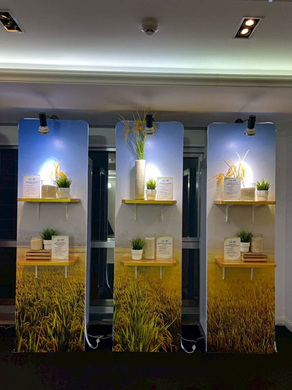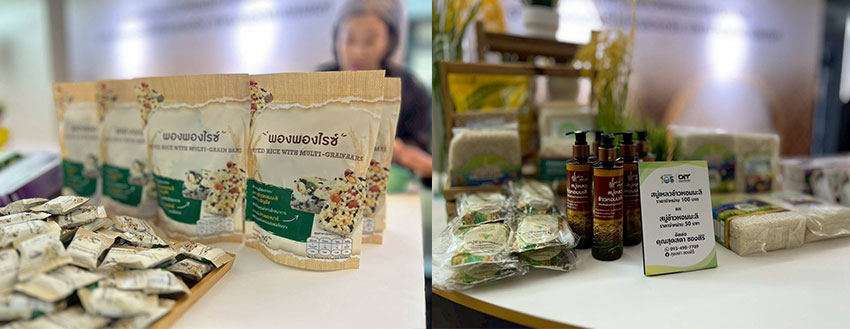 ทั้งนี้ ภายในงานมีการจัดแสดงนิทรรศการและผลิตภัณฑ์ของผู้ชนะการประกวดข้าวหอมมะลิฯ การทำ MOU เชื่อมโยงการซื้อขายระหว่างผู้ประกอบการค้าข้าวกับผู้ชนะการประกวด มีผลิตภัณฑ์ข้าวของผู้ชนะการประกวดฯ หลากหลายแบรนด์ ที่นำมาให้ชิมและจำหน่ายในราคาพิเศษ อาทิ ข้าวหอมมะลิอินทรีย์ (ข้าวภูลังกา) และข้าวตราเรือไฟ จาก จ.นครพนม ข้าวตราช้างชุมพล จ.สุรินทร์ ข้าวนาคุณตาณรงค์ จ.อุบลราชธานี ข้าวจากกลุ่มข้าวปลอดสารพิษ ต.แม่อ้อ จ.เชียงราย และผลิตภัณฑ์ที่ต่อยอดจากข้าวหอมมะลิ เช่น ผลิตภัณฑ์ข้าวจากธัญพืช “พองพองไรซ์” ผลิตภัณฑ์นวัตกรรม “ข้าวแท่ง (Rice Bar)” ไอศกรีมข้าวหอมมะลิจากเกษตรกร จ.ฉะเชิงเทรา และเครื่องดื่ม MR.SATO ที่รังสรรค์จากข้าวไทย และความใส่ใจแบบคราฟต์ นอกจากนี้ ภายในงานยังมีพื้นที่สาธิตการตรวจสอบคุณภาพข้าวทางวิชาการโดยสำนักงานคณะกรรมการตรวจข้าว สภาหอการค้าแห่งประเทศไทย