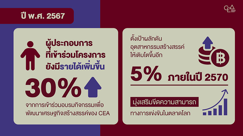 คุณอาสา ผิวขำ ผู้อำนวยการสำนักพัฒนาธุรกิจและนวัตกรรม จาก CEA กล่าวว่า ปัจจุบัน อุตสาหกรรมสร้างสรรค์เป็นหนึ่งในกำลังสำคัญในการขับเคลื่อนเศรษฐกิจไทย และมีแนวโน้มที่จะทวีความสำคัญขึ้นเรื่อย ๆ ตัวเลขมูลค่าของอุตสาหกรรมสร้างสรรค์ยังสะท้อนให้เห็นถึงการเติบโตอย่างต่อเนื่อง โดยในปี พ.ศ. 2566 อุตสาหกรรมสร้างสรรค์ 15 สาขาของไทยมีมูลค่ารวมสูงถึง 1.44 ล้านล้านบาท หรือคิดเป็น 8.01% ของ GDP ประเทศ และก่อให้เกิดการจ้างงานเกือบ 1 ล้านคน โดยในปี 2567 ผู้ประกอบที่เข้าร่วมโครงการของ CEA มีรายได้เฉลี่ยเพิ่มขึ้นไม่น้อยกว่า 30% จากการเข้าร่วมอบรมกิจกรรมเพื่อยกระดับธุรกิจสร้างสรรค์ พร้อมตั้งเป้าผลักดันอุตสาหกรรมสร้างสรรค์ให้เติบโตขึ้นอีก 5% ภายในปี 2570 มุ่งเสริมขีดความสามารถทางการแข่งขันในตลาดโลก