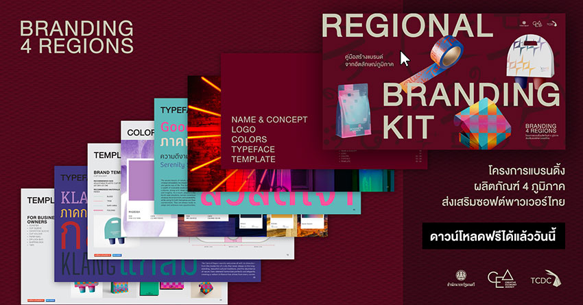 สำนักงานส่งเสริมเศรษฐกิจสร้างสรรค์ (องค์การมหาชน) หรือ CEA ต่อยอดความสำเร็จ ขับเคลื่อนเศรษฐกิจสร้างสรรค์ เปิดตัว “โครงการแบรนดิ้งผลิตภัณฑ์ 4 ภูมิภาค ส่งเสริมซอฟต์พาวเวอร์ไทย” (Branding 4 Regions) สำหรับผู้ประกอบการไทยทั่วประเทศ ทั้ง กลาง อีสาน เหนือ ใต้ วางรากฐาน ยกระดับสินค้า สร้างมูลค่าเพิ่มขีดความสามารถทางการแข่งขันในตลาดโลก ด้วยกลยุทธ์ Creative Ecosystem อย่างเป็นระบบ พร้อมมอบองค์ความรู้ในการพัฒนาศักยภาพธุรกิจ ด้วยชุดสร้างแบรนดิ้งสำเร็จรูปพร้อมใช้งาน (Regional Branding Kit) สะท้อนอัตลักษณ์ท้องถิ่นร่วมสมัย ประกอบไปด้วย ธีมและคอนเซ็ปต์ บอกเล่าเรื่องราวของแบรนด์ในแต่ละภูมิภาค รวมไปถึงแนวทางการสร้างสรรค์โลโก้ โทนสีหลัก ฟ้อนต์ และมีเทมเพลตพื้นฐาน สำหรับนำไปพัฒนา ประยุกต์ใช้กับสินค้า การบริการ และการสื่อสารอัตลักษณ์ของแบรนด์ได้อย่างมีประสิทธิภาพ อาทิ บรรจุภัณฑ์ แผ่นรองแก้ว ถุงกระดาษ เทปกาว ปลอกหุ้มแก้ว ซองตะเกียบ เป็นต้น ซึ่งสามารถดาวน์โหลดได้ฟรี แบบไม่มีค่าใช้จ่าย ตั้งแต่วันนี้เป็นต้นไป