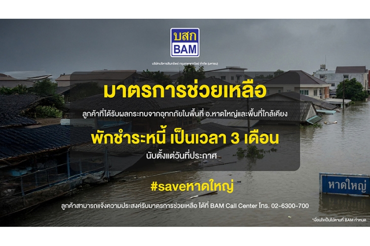 “BAM มีความห่วงใยทั้งลูกค้าและพนักงานของเรา รวมไปถึงชุมชนในพื้นที่ที่ประสบภัยน้ำท่วมในพื้นที่อำเภอหาดใหญ่และภาคใต้ จึงได้สั่งการให้เจ้าหน้าที่ทางสำนักงานภูมิภาคซึ่งไม่ได้รับผลกระทบเร่งลงไปให้ความช่วยเหลือเบื้องต้นก่อน ส่วนอื่นๆ เพิ่มเติมก็สามารถส่งเรื่องเพื่อขออนุมัติให้ความช่วยเหลือในด้านการผ่อนปรนเงื่อนไขการชำระหนี้ เพื่อเป็นการบรรเทาความเดือดร้อนของลูกค้าต่อไป” ดร.รักษ์ กล่าว