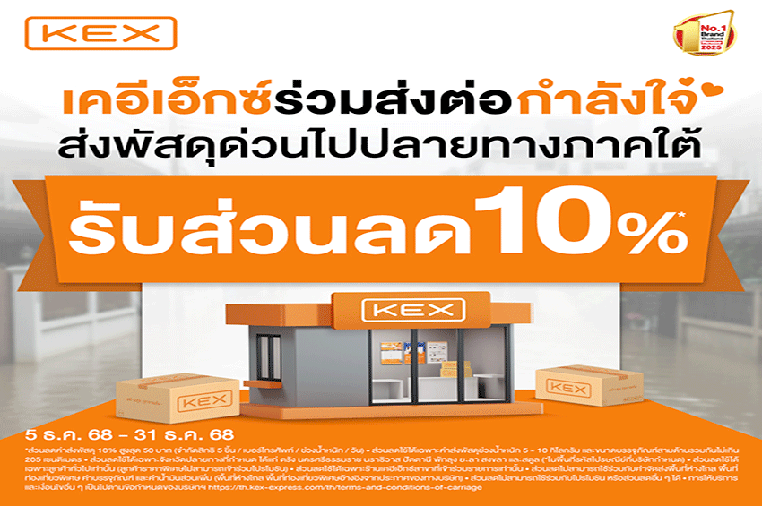 เดินหน้าเต็มกำลังเพื่อรักษาการให้บริการจัดส่งพัสดุสู่ภาคใต้อย่างต่อเนื่อง ด้วยมาตรฐานความรวดเร็ว ปลอดภัยและเชื่อถือได้ แม้สภาพอากาศจะส่งผลต่อการคมนาคมในบางพื้นที่ KEX ยืนหยัดดำเนินงานภายใต้ความพร้อมของเครือข่าย การบริหารจัดการกำลังการให้บริการเชิงรุก และการประสานงานในพื้นที่อย่างใกล้ชิด เพื่ออำนวยความสะดวกให้ลูกค้าสามารถจัดส่งสิ่งของจำเป็นไปยังภาคใต้ได้อย่างมั่นใจ พร้อมรองรับความต้องการจัดส่งที่เพิ่มขึ้นในช่วงเวลาดังกล่าว และมอบส่วนลดค่าส่งทันที 10%* เพื่อช่วยแบ่งเบาภาระค่าใช้จ่ายให้แก่ครัวเรือน ภาคธุรกิจ และหน่วยงานต่างๆ ในช่วงของการฟื้นฟู