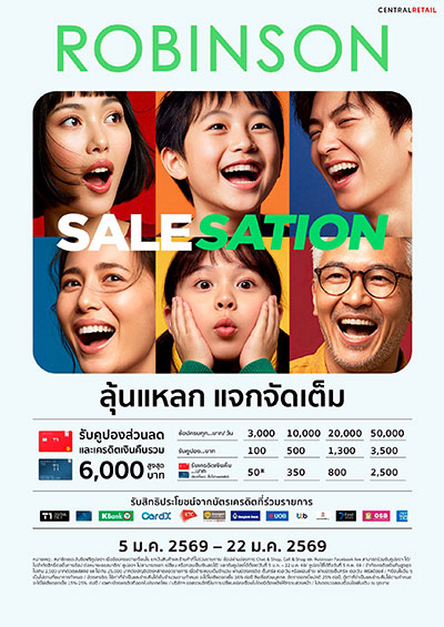 ร่วมสัมผัสประสบการณ์ ‘ช้อปคุ้ม ลุ้นสนุก’ รับปีใหม่ กับการคิกออฟซิกเนเจอร์แคมเปญแห่งปี “ROBINSON SALESATION” ลุ้นแหลก แจกจัดเต็ม ตั้งแต่วันที่ 5 ม.ค. 69 – 22 ม.ค. 69 ที่ห้างโรบินสันทุกสาขา (ยกเว้นสาขาจังซีลอน) และทุกช่องทางการช้อปปิ้งของห้างฯ ไม่ว่าจะเป็น Robinson Chat & Shop, Robinson Personal Shopper On Demand ผู้ช่วยช้อปส่วนตัวที่พร้อมดูแลทุกความต้องการ, Central App และเว็บไซต์ www.central.co.th ตลอด 24 ชั่วโมง รวมถึง Facebook Page: Robinson Department Store พร้อมเติมเต็มความสุขให้ทุกครอบครัวในวันเด็กแห่งชาติ กับแคมเปญ “ROBINSON KIDS DAY” ที่อัดแน่นกิจกรรมสร้างสรรค์และความสนุกสำหรับน้อง ๆ หนู ๆ ในวันที่ 10 ม.ค. 69 – 11 ม.ค. 69 ที่ห้างโรบินสันสาขาที่ร่วมกิจกรรมทั่วประเทศ