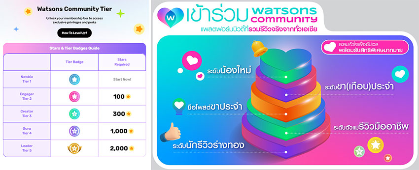 นอกจากการเป็นพื้นที่แลกเปลี่ยนรีวิวกันแล้ว Watsons Community ยังยกระดับประสบการณ์การใช้งาน ที่ออกแบบมาเพื่อกระตุ้นการมีส่วนร่วมของสมาชิก ผ่านการสะสมคะแนนและสิทธิพิเศษตามระดับ(Engagement Levels) ซึ่งแบ่งออกเป็น 5 ระดับ ได้แก่ น้องใหม่ (Newbie), ขา(เกือบ)ประจำ (Engager) , มือโพสต์ขาประจำ (Creator), ตัวแม่รีวิวมืออาชีพ (Guru) และระดับสูงสุด “นักรีวิวร่างทอง” (Leader) เพื่อสร้างแรงจูงใจ ความภาคภูมิใจ และการมีส่วนร่วมอย่างต่อเนื่องตั้งแต่ครั้งแรกที่เริ่มใช้งาน