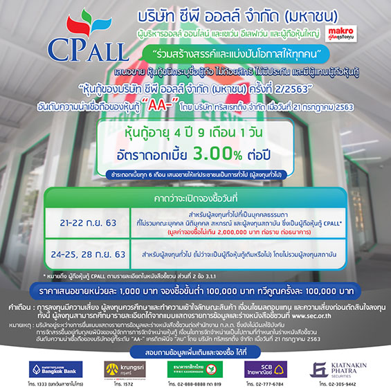 เตรียมพร้อมสำหรับโอกาสการลงทุนครั้งใหม่กับ หุ้นกู้ บมจ.ซีพี ออลล์ (CPALL) ผู้บริหารออลล์ ออนไลน์ และเซเว่น อีเลฟเว่น และผู้ถือหุ้นใหญ่ในสยามแม็คโคร (MAKRO) เตรียมเสนอขายหุ้นกู้ 4 รุ่น อันดับความน่าเชื่อถือ AA- จัดอันดับโดยทริสเรทติ้ง โดยรุ่นอายุ 4 ปี 9 เดือน 1 วัน อัตราดอกเบี้ย 3.00% ต่อปี เสนอขายแก่ผู้ถือหุ้นกู้เดิมของบริษัทฯ คาดว่าเสนอขายระหว่างวันที่ 21-22 ก.ย. และเสนอขายแก่ผู้ลงทุนทั่วไป คาดว่าเสนอขายระหว่างวันที่ 24-25 และ 28 ก.ย. ส่วนหุ้นกู้อีก 3 รุ่น เสนอขายแก่ผู้ลงทุนรายใหญ่และผู้ลงทุนสถาบันคาดว่าเสนอขายระหว่างวันที่ 24-25 และ 28 ก.ย. ซึ่งประกอบด้วย รุ่นอายุ 2 ปี 5 เดือน 17 วัน อัตราดอกเบี้ย 1.90% ต่อปี รุ่นอายุ 9 ปี 7 เดือน 14 วัน อัตราดอกเบี้ย 3.40% ต่อปี และรุ่นอายุ 15 ปี อัตราดอกเบี้ย 3.90% ต่อปี