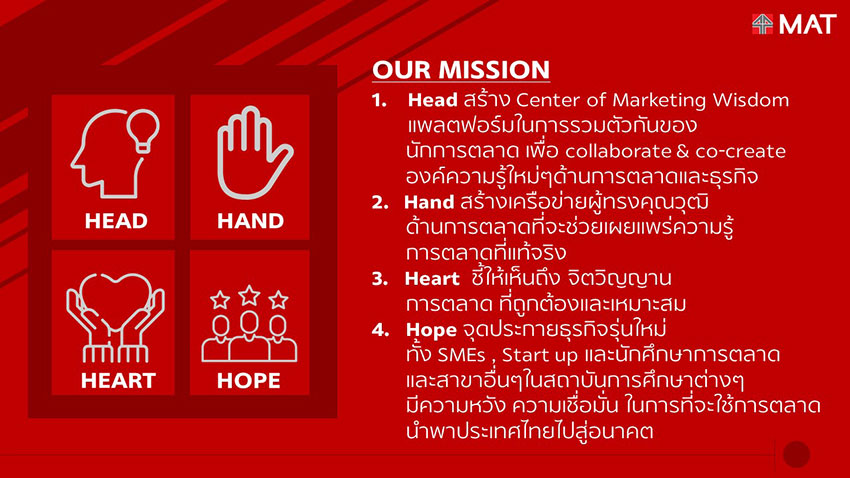 - สร้าง Hope เพื่อจุดประกายธุรกิจด้วยการสร้างนักการตลาดยุคใหม่ เน้นสร้างนักการตลาดรุ่นใหม่ผ่านโครงการ J-MAT (Junior Marketing Association of Thailand) โดยผนึกกำลังกับภาคการศึกษา เสริมประสบการณ์แก่นักศึกษาธุรกิจและการตลาดให้มีศักยภาพ พร้อมเข้าสู่โลกธุรกิจ และเติมความรู้ด้านการตลาดยุคใหม่ให้แก่นักการตลาดที่ต้องการ Reskill & Upskill เพื่อสร้างความหวังและความเชื่อมั่น ในการที่จะใช้การตลาดนำพาประเทศไทยไปสู่โลกการตลาดยุคใหม่