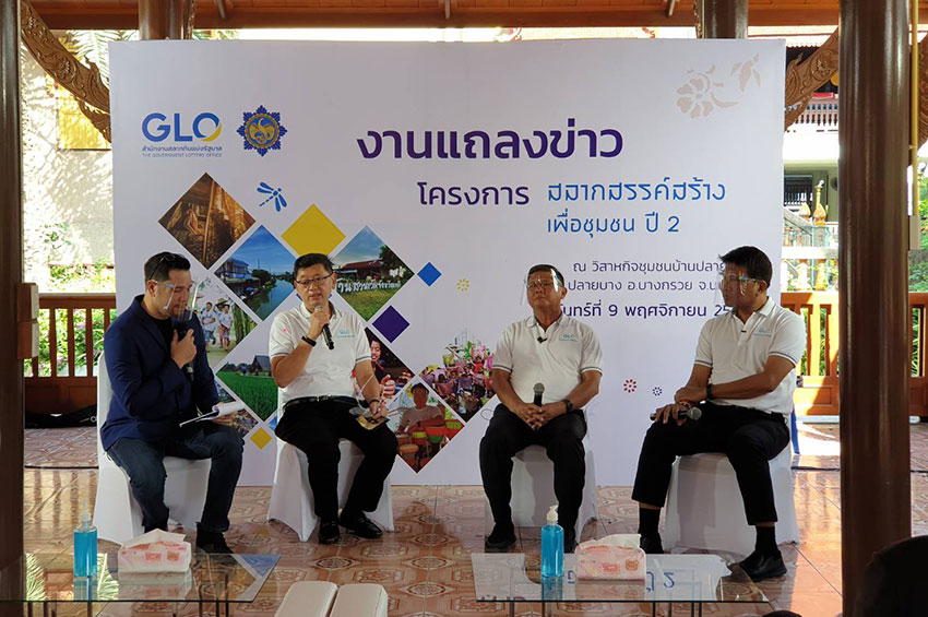 พร้อมด้วย พันตำรวจเอก บุญส่ง จันทรีศรี ผู้อำนวยการสำนักงานสลากกินแบ่งรัฐบาล ร่วมกันแถลงข่าวโครงการสลากสรรค์สร้างเพื่อชุมชน ปี 2 ณ วิสาหกิจชุมชนบ้านปลายบาง ตำบลปลายบาง อำเภอบางกรวย จังหวัดนนทบุรี