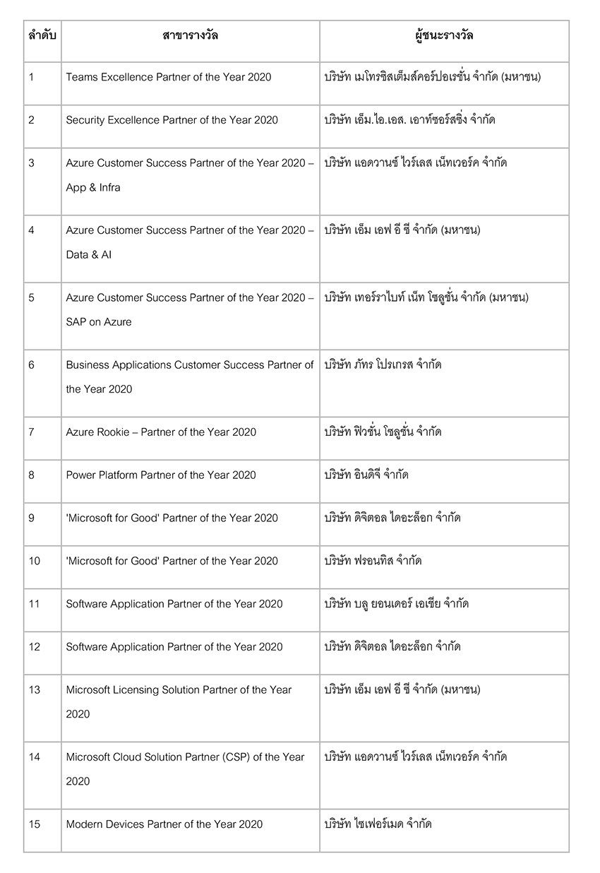 ไมโครซอฟท์ ประเทศไทย ประกาศมอบรางวัล Partner of the Year 2020 ยกย่องพันธมิตรที่นำเสนอนวัตกรรมและให้บริการโซลูชันอันยอดเยี่ยมแก่ลูกค้า บนเทคโนโลยีของไมโครซอฟท์