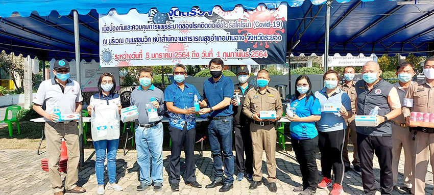 อาทิ หน้ากากอนามัย เจลแอลกอฮอลล์ล้างมือ และสนับสนุนอาหารและน้ำดื่มให้กับเจ้าหน้าที่ของจังหวัด อำเภอ สาธารณสุข และเทศบาลต่าง ๆ ซึ่งปฏิบัติงาน ณ จุดให้บริการตรวจคัดกรองเชิงรุก และจุดตรวจเพื่อป้องกันและควบคุมการติดต่อของเชื้อโควิด-19 จังหวัดระยอง