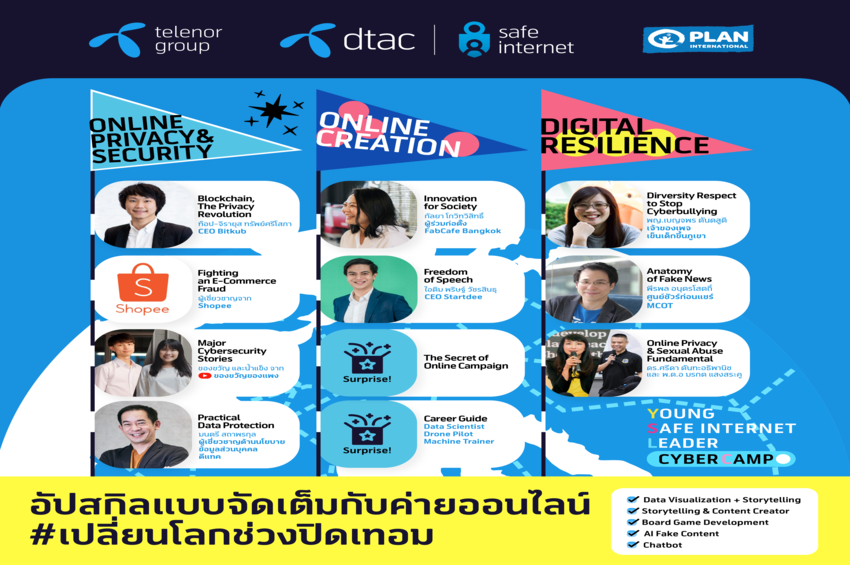 ลที่จำเป็นและทักษะรับมือกั บความเสี่ยงออนไลน์ใหม่ๆ ไม่ว่าจะเป็น เรื่องอาชญากรรมไซเบอร์ ภัยคุกคามและการรักษาข้อมูลส่ วนบุคคล การถูกล่วงละเมิดหรื อแสวงหาประโยชน์ทางเพศบนสั งคมออนไลน์ เท่าทันกลโกงในการซื้อ-ขายออนไล น์ การทำความเข้าใจในเสรี ภาพในการแสดงออกบนโลกออนไลน์เพื่ อสร้างการเปลี่ยนแปลงสังคมอย่ างสร้างสรรค์ และมหาสมุทรแห่งสารสนเทศและอั ลกอริทึม เป็นต้น