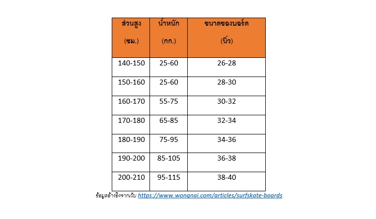 1. วิธีการเลือกบอร์ดให้เหมาะสม การเลือกอุปกรณ์ที่เหมาะสม ถือเป็นสิ่งสำคัญในทุกๆกิจกรรม การเลือกบอร์ดของเซิร์ฟสเก็ตก็เช่นกัน คุณสามารถเลือกขนาดของบอร์ดที่เหมาะสมตามน้ำหนักและส่วนสูงได้ตามตารางด้านล่างนี้