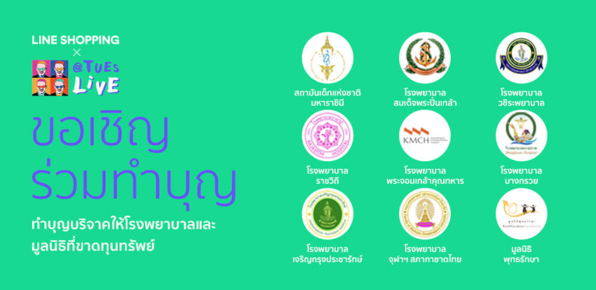 จากสถานการณ์การแพร่ระบาดของโควิด-19 ส่งผลกระทบเป็นวงกว้างและเป็นปัญหาของทุกคน ที่ต้องช่วยเหลือกันอย่างเร่งด่วน โดยรายการ LINE SHOPPING x @TuesLIVE นำโดย ป้าตือ-สมบัษร ถิระสาโรช พิธีกรประจำรายการ เชิญชวนคนไทยใจบุญร่วมเป็นสื่อกลางในการรับบริจาค ผ่านแคมเปญ “ร่วมด้วย ช่วยโควิด-19” เพื่อช่วยเหลือหน่วยงานทั้งโรงพยาบาลและมูลนิธิ จำนวน 15 หน่วยงาน ได้แก่ โรงพยาบาลจุฬาลงกรณ์ สภากาชาดไทย, โรงพยาบาลเจริญกรุงประชารักษ์, โรงพยาบาลบางกรวย, โรงพยาบาลบ้านแพ้ว, โรงพยาบาลปิ่นเกล้า, โรงพยาบาลพระจอมเกล้าเจ้าคุณทหาร, โรงพยาบาลภูมิพลอดุลยเดช, โรงพยาบาลราชวิถี, โรงพยาบาลวชิรพยาบาล, สถาบันเด็กแห่งชาติมหาราชินี, โรงพยาบาลหลวงพ่อทวีศักดิ์ ชุตินุธโร อุทิศ, มูลนิธิช่วยคนตาบอดแห่งประเทศไทยในพระบรมราชินูปถัมภ์, มูลนิธิดวงประทีป, มูลนิธิพระมหาไถ่พัทยา และมูลนิธิพุฒรักษาเพื่อเป็นทุนทรัพย์และเป็นกองกำลังสำคัญ ในการช่วยเหลือคนไทย ให้รอดพ้นจากวิกฤตโควิด-19 ครั้งนี้”