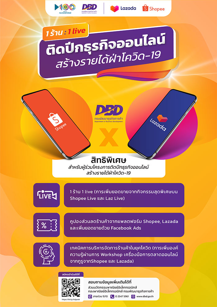 ผู้ประกอบการที่มีร้านค้าออนไลน์บน Shopee และ Lazada สนใจเข้าร่วมกิจกรรม ‘1 ร้าน 1 live : ติดปีกธุรกิจออนไลน์สร้างรายได้ฝ่าวิกฤตโควิด-19’ สมัครเข้าร่วมฯ ได้ที่ https://bit.ly/tidpeek สอบถามข้อมูลเพิ่มเติมที่ ส่วนนวัตกรรมพาณิชย์อิเล็กทรอนิกส์ กองพาณิชย์อิเล็กทรอนิกส์ กรมพัฒนาธุรกิจการค้า สายด่วน 1570 โทรศัพท์หมายเลข 0 2547 5961 และ www.dbd.go.th อธิบดีฯ กล่าวทิ้งท้าย