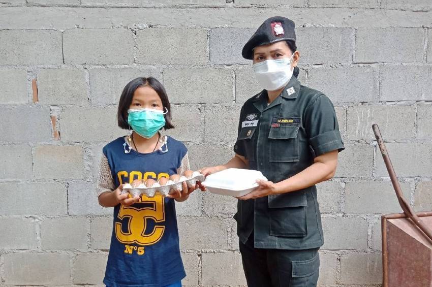 ที่โรงเรียน ตชด.การบินไทย ต.ไทรเดี่ยว อ.คลองหาด จ.สระแก้ว ซึ่งปีนี้ร่วมโครงกาฯมาเป็นปีที่ 18 แล้ว ด.ต.หญิงรุ่งอรุน ค่ำชู ครูผู้ดูแลโครงการเลี้ยงไก่ไข่เพื่ออาหารกลางวันนักเรียน เล่าว่า โรงเรียนเปิดสอนตั้งแต่ชั้นอนุบาล-ประถมศึกษาปีที่ 6 มีเด็กนักเรียน 140 คน ในพื้นที่บริการ 3 หมู่บ้าน เด็กๆส่วนใหญ่อาศัยอยู่กับปู่ย่าตายาย ที่ทำอาชีพทำนา ทำไร่ และรับจ้าง เพราะพ่อแม่ต้องไปทำงานต่างจังหวัด โรงเรียนเลี้ยงไก่ไข่ 150 ตัว จากการสนับสนุนของซีพีเอฟ หรือ บริษัท เจริญโภคภัณฑ์อาหาร จำกัด (มหาชน) และมูลนิธิเจริญโภคภัณฑ์พัฒนาชีวิตชนบท ให้พันธุ์ไก่ อาหารสัตว์ พร้อมโรงเรือนแบบให้เปล่าในรุ่นแรก เมื่อปี 2546 ทำให้โรงเรียนสามารถบริหารจัดการได้อย่างต่อเนื่อง จนปัจจุบันเลี้ยงไก่ไข่เป็นรุ่นที่ 12 ตอนนี้ไก่เป็นช่วงท้ายของการให้ผลผลิต และทยอยปลดระวางแม่พันธุ์ไก่ไข่ ทำให้มีไข่ประมาณ 100 ฟองต่อวัน โดยในช่วงโควิด 19 ที่เด็กๆต้องเรียนที่บ้าน โรงเรียนจัดสอนออนไลน์ และครูประจำชั้นไปส่งเอกสารใบงานต่างๆให้ที่บ้าน ทุกๆวันอังคารครูจะจัดพืชผักสวนครัวและไข่ไก่ไปให้นักเรียน คนละ 10 ฟอง ส่วนวันศุกร์จะทำข้าวกล่องไปแจก เพราะโรงเรียนเล็งเห็นปัญหาที่นักเรียนต้องอยู่กับผู้ปกครองที่อยู่ในวัยชราและรายได้ไม่เพียงพอ จึงขอเป็นส่วนหนึ่งในการช่วยเหลือเด็กนักเรียนและลดค่าครองชีพให้กับผู้ปกครอง นอกเหนือจากการจำหน่ายไข่ไก่ในราคาย่อมเยาผ่านสหกรณ์ และการสนับสนุนให้ซื้อแม่พันธุ์ไก่ปลดระวางที่ยังให้ผลผลิตไปเลี้ยงต่อที่บ้าน ช่วยลดรายจ่ายและเป็นคลังอาหารของครอบครัว