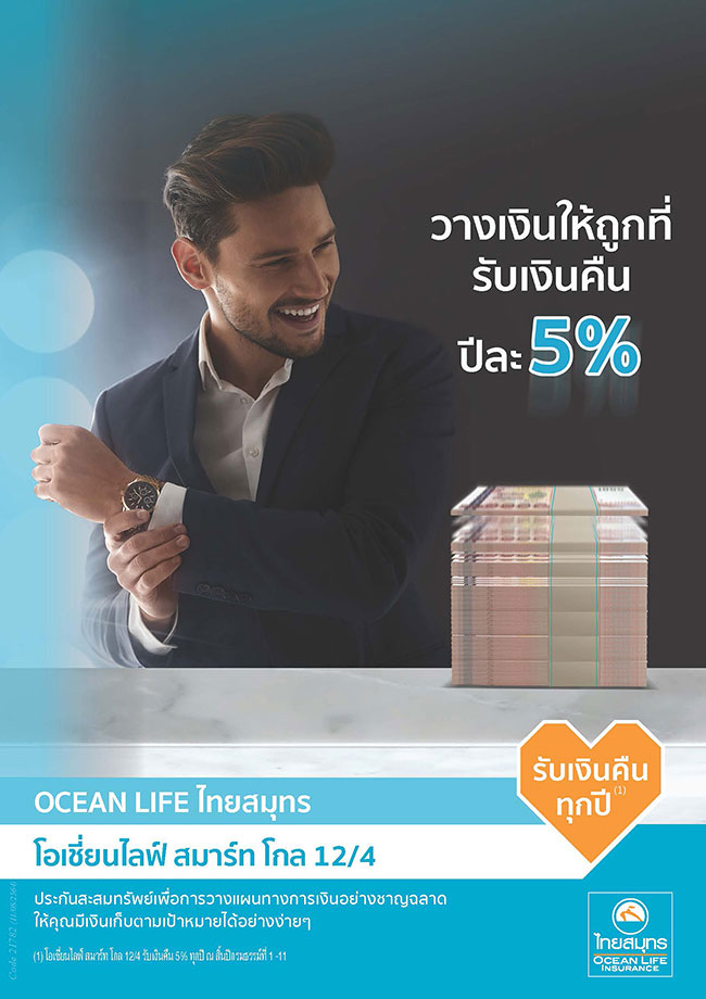 เผยว่า จากสถานการณ์วิกฤตที่เข้ามาอย่างรวดเร็วทำหลายคนตั้งรับไม่ทัน ดังนั้น เราจึงส่งตัวช่วยในการวางแผนเป้าหมายทางการเงินระยะกลาง ที่จะช่วยแบ่งเบาภาระให้คุณและคนที่รักได้ ด้วยแบบประกันใหม่ล่าสุด! “โอเชี่ยนไลฟ์ สมาร์ท โกล 12/4” ประกันสะสมทรัพย์จาก OCEAN LIFE ไทยสมุทร ประกันที่ตอบโจทย์ทุกความต้องการ เพื่อการวางแผนทางการเงินอย่างชาญฉลาด ทั้งความคุ้มครองชีวิต(1) สูงสุด 405% ของจำนวนเงินเอาประกันภัย (ระหว่างปีกรมธรรม์ที่ 4 - 12) พร้อมรับเงินคืนระหว่างสัญญา 5% ของจำนวนเงินเอาประกันภัย ณ สิ้นปีกรมธรรม์ที่ 1 - 11 และเงินครบกำหนดสัญญา 405% ของจำนวนเงินเอาประกันภัย รวมรับผลประโยชน์ตลอดอายุสัญญาสูงสุดถึง 460% ของจำนวนเงินเอาประกันภัย จ่ายเบี้ยประกันภัยรายปีเพียง 4 ปี รับความคุ้มครองนาน 12 ปี เพื่อให้คุณวางแผนการใช้ชีวิตได้อย่างเต็มที่ ที่สำคัญยังสามารถขอทำสัญญาเพิ่มเติมอื่น ๆ ได้ เช่น สัญญาเพิ่มเติมคุ้มครองสุขภาพที่มีค่ารักษาการติดเชื้อไวรัส COVID-19 สัญญาเพิ่มเติมคุ้มครองโรคร้ายแรง หรือสัญญาเพิ่มเติมคุ้มครองอุบัติเหตุ ฯลฯ รับประกันภัยบุคคลอายุตั้งแต่ 30 วัน - 70 ปี โดยเบี้ยประกันภัยสามารถนำไปอ้างอิงลดหย่อนภาษี ตามหลักเกณฑ์ที่กรมสรรพากรกำหนด