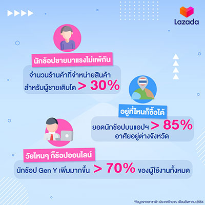 - ผู้หญิงยังครองแชมป์ แต่นักช้อปชายมาแรงไม่แพ้กัน ลาซาด้ามียอดนักช้อปหญิงมากถึง 52% ทำให้สินค้าสำหรับผู้หญิง อย่าง สกินแคร์ เครื่องสำอาง เสื้อผ้า ยังคงเป็นที่ต้องการในตลาดอีคอมเมิร์ซ ส่วนนัก ช้อปชายก็หันมาซื้อสินค้าออนไลน์เพิ่มมากขึ้น และจำนวนร้านค้าที่จำหน่ายสินค้าสำหรับผู้ชายก็เติบโตกว่า 30% เมื่อเทียบกับปี 2563