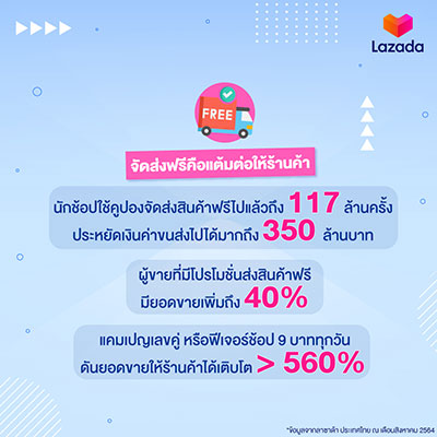 - นักช้อปคาดหวังในบริการด้านการจัดส่งมากขึ้น การจัดส่งสินค้าฟรีจึงเป็นแต้มต่อให้กับร้านค้า ตั้งแต่ต้นปีที่ผ่านมา นักช้อปใช้คูปองจัดส่งสินค้าฟรีบนแอปฯ ลาซาด้าไปแล้วถึง 117 ล้านครั้ง ช่วยผู้บริโภคประหยัดเงินค่าขนส่งไปได้มากถึง 350 ล้านบาท ส่วนผู้ขายที่มีโปรโมชั่นส่งสินค้าฟรีพบว่ามียอดขายเพิ่มมากขึ้นถึง 40% นอกจากนี้ โครงการอื่นๆ ของลาซาด้า เช่น แคมเปญเลขคู่ หรือฟีเจอร์ช้อป 9 บาททุกวัน ก็ช่วยดันยอดขายให้ร้านค้าได้เติบโต 560% ลาซาด้าจึงจัดโปรโมชั่นส่งสินค้าฟรีในแคมเปญต่างๆ อย่างต่อเนื่อง รวมถึงแคมเปญ 9 Mega Brands Sale เมกะแคมเปญที่จะมาถึงในเดือนกันยายนนี้ พร้อมระบบลาซาด้าโลจิสติกส์ที่รวดเร็วและครอบคลุมเพื่อช่วยผู้ขายตอบสนองความต้องการของผู้บริโภคและสนับสนุนให้คนไทยก้าวผ่านช่วงเวลาที่ท้าทายนี้ไปด้วยกัน