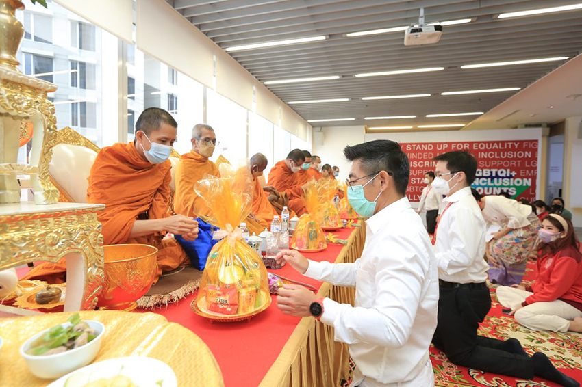 นายบัณฑิต เจียมอนุกูลกิจ ประธานเจ้าหน้าที่บริหาร กลุ่มบริษัท เจนเนอราลี่ ไทยแลนด์ (ที่ 6 จากซ้าย) นำทีมคณะผู้บริหารระดับสูงและพนักงาน เจนเนอราลี่ ไทยแลนด์ จัดพิธีบวงสรวงองค์ท้าวมหาพรหมและทำบุญถวายภัตตาหารเพล