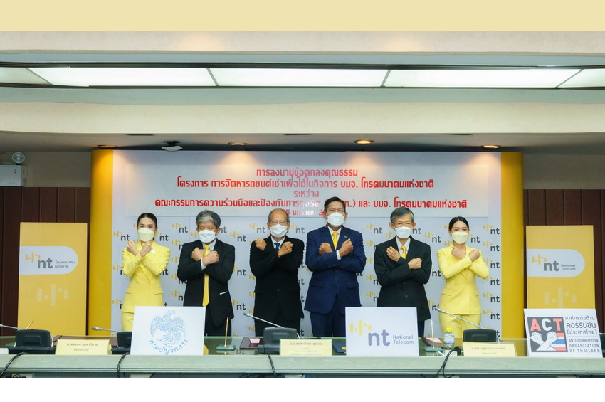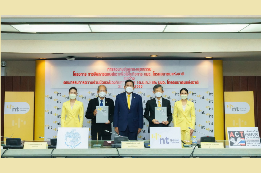 บริษัท โทรคมนาคมแห่งชาติ จำกัด (มหาชน) สำนักงานแจ้งวัฒนะ นาวาอากาศเอก สมศักดิ์ ขาวสุวรรณ์ กรรมการและรักษาการกรรมการผู้จัดการใหญ่ บริษัท โทรคมนาคมแห่งชาติ จำกัด (มหาชน) หรือ NT พร้อมด้วยคณะผู้สังเกตการณ์ ประกอบด้วย นายสมยศ สุนทรวิภาต และนายทรงวุฒิ หวังธรรมคุ้ม ผู้แทนคณะกรรมการความร่วมมือและป้องกันการทุจริต (คปท.) จากกรมบัญชีกลาง และองค์กรต่อต้านคอร์รัปชัน (ประเทศไทย) ร่วมพิธีลงนามข้อตกลงคุณธรรม “โครงการ การจัดหารถยนต์เช่าเพื่อใช้ในกิจการ บมจ.โทรคมนาคมแห่งชาติ” เพื่อเพิ่มประสิทธิภาพการใช้จ่ายเงินงบประมาณ ยกระดับความโปร่งใสของโครงการจัดซื้อจัดจ้างภาครัฐ และสร้างความเชื่อมั่นให้กับทุกภาคส่วนที่เกี่ยวข้องกับการจัดหาตามโครงการดังกล่าว ซึ่งจะก่อให้เกิดการแข่งขันอย่างเป็นธรรมใช้งบประมาณให้เกิดประโยชน์สูงสุดต่อประเทศชาติอย่างแท้จริง