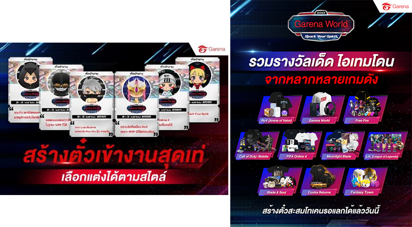 เตรียมตัวให้พร้อมด้วยการดีไซน์ Avatar ประจำตัว หรือตั๋วเข้างานสไตล์คุณ และลุ้นรางวัลไอเทมต่าง ๆ จากหลากหลายเกมดังของการีนา พร้อมร่วมส่งพลังบวก เติมเต็มบันดาลใจไปด้วยกันที่ “Garena World 2022: Spark Your Spirit” ตลอดวันเสาร์ที่ 2 เมษายน และวันอาทิตย์ที่ 3 เมษายน 2565 ตั้งแต่เวลา 11.30 น. เป็นต้นไป บนเว็บไซต์ Garena World https://garenaworld.in.th