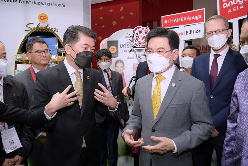 นายจุรินทร์ ลักษณวิศิษฏ์ รองนายกรัฐมนตรีและรัฐมนตรีว่าการกระทรวงพาณิชย์ พร้อมด้วย นายภูสิต รัตนกุล เสรีเริงฤทธิ์ อธิบดีกรมส่งเสริมการค้าระหว่างประเทศ และนายสนั่น อังอุบลกุล ประธานสภาหอการค้าแห่งประเทศไทย เยี่ยมชมบูธ บริษัท เจริญโภคภัณฑ์อาหาร จำกัด (มหาชน) หรือ ซีพีเอฟ ในงาน THAIFEX-ANUGA ASIA 2022 โดยมี นายประสิทธิ์ บุญดวงประเสริฐ ประธานคณะผู้บริหาร ซีพีเอฟ ให้การต้อนรับ