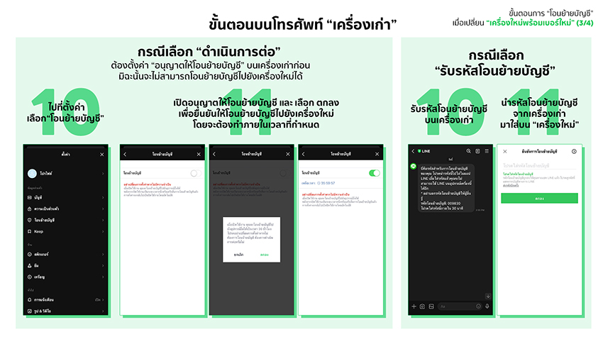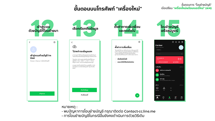 หากพบปัญหาการโอนย้ายข้อมูล กรุณาติดต่อ Contact-cc.line.me
