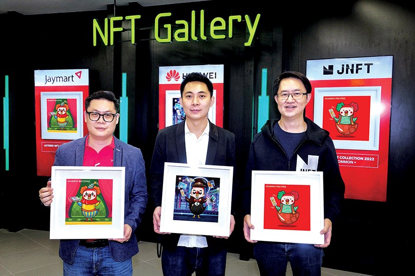 นายธีรวัฒน์ จันทร์วิจิตรกุล ผู้ช่วยผู้อำนวยการ สายงานการตลาด บริษัท เจมาร์ท โมบาย จำกัด (Jaymart Mobile) ร่วมกับ Mr. Louie Hu, Marketing Director of HUAWEI Consumer Business Group และนายวรพจน์ ธาราศิริสกุล CTO บริษัท เจ เวนเจอร์ (J Ventures) ถ่ายภาพเปิดตัวแคมเปญพิเศษในครั้งนี้ร่วมกันและเตรียมจัดการประมูล HUAWEI x Jaybird NFT Exclusive Collection 2022 ในชุด Super Rare จำนวน 1 ชิ้น พร้อมรับผลิตภัณฑ์ HUAWEI ได้แก่ HUAWEI MateBook 14s i5 version (8GB+512GB), HUAWEI P50 Pro และHUAWEI MatePad 10.4-inch 2022, HUAWEI Smart Keyboard, HUAWEI M-Pencil (2nd generation package) รวมมูลค่า 90,750 บาท ผ่านแพลตฟอร์ม JNFT เริ่มการประมูล ตั้งแต่ 28 กรกฎาคม 2565 ถึงวันที่ 7 สิงหาคม 2565
