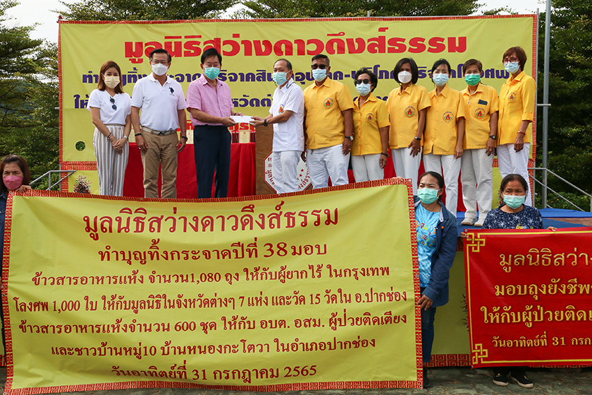 อาทิ ยารักษาโรค รองเท้ายาง จำนวน 1,680 ชุด ให้กับผู้ยากไร้และผู้ป่วยติดเตียง พร้อมกันนี้ยังร่วมบริจาคโลงศพ จำนวน 200 หีบ และผ้าห่อศพ ให้กับมูลนิธิสว่างดาวดึงส์ (ปากช่อง) เพื่อไปมอบให้วัดและมูลนิธิต่างๆ โดยมีคุณวิชัย ชูชัยเจริญ ประธานมูลนิธิสว่างดาวดึงส์ธรรมและประธานจัดงาน ร่วมมอบ ณ อุทยานวิหารเซียน ปากช่อง