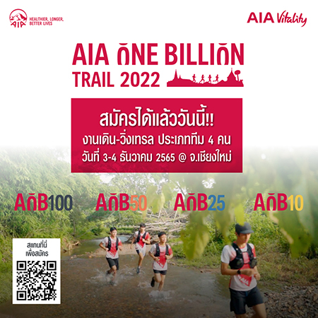 เอไอเอ ประเทศไทย บริษัทประกันชีวิตอันดับ 1 ของประเทศ* ที่เข้าใจความต้องการของคนไทย เปิดตัวงานเดิน-วิ่งเทรลประเภททีม 4 คน ครั้งแรกในประเทศไทย ภายใต้ชื่อ AIA One Billion Trail 2022 ตอกย้ำคำมั่นสัญญา ‘Healthier, Longer, Better Lives – เพื่อสุขภาพและชีวิตที่ดีขึ้น’ โดยเปิดโอกาสให้นักวิ่งได้เข้าร่วมแข่งขันแบบทีม 4 คน บนเส้นทางที่รายล้อมด้วยธรรมชาติที่สวยงามจากดอยอินทนนท์ถึงดอยสุเทพ จังหวัดเชียงใหม่ เพื่อพิชิตเป้าหมายทั้งในด้านพละกำลัง ความแข็งแกร่ง รวมไปจนถึงด้านจิตใจของทุกคนในทีมที่ต้องมีความสามัคคี ความอดทน และการช่วยเหลือซึ่งกันและกัน ซึ่งถือเป็นจุดเริ่มต้นที่สำคัญต่อการมีสุขภาพกายและใจที่แข็งแรงในระยะยาว อีกทั้งนักวิ่งทุกคนรวมถึงประชาชนทั่วไปยังมีโอกาสได้ร่วมบริจาคเงินเพื่อสมทบทุนโครงการส่งเสริมและพัฒนาการพูด อ่าน เขียนภาษาไทย โดยสภากาชาดไทย เพื่อช่วยเหลือเด็กนักเรียนในถิ่นทุรกันดาร ซึ่ง AIA One Billion Trail 2022 จะจัดขึ้นระหว่างวันที่ 2-4 ธันวาคม 2565 ณ จังหวัดเชียงใหม่ โดยเริ่มเปิดรับสมัครนักวิ่งเทรลเข้าร่วมงานแล้วที่เว็บไซต์ aiaonebilliontrail.run