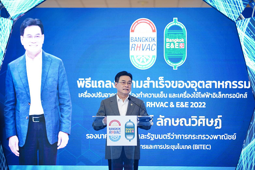 นายจุรินทร์ กล่าวว่า อุตสาหกรรมเครื่องใช้ไฟฟ้าและอิเล็กทรอนิกส์มีความสำคัญอย่างมากต่อเศรษฐกิจไทยเพราะก่อให้เกิดความสร้างงานในประเทศมากกว่า 640,000 คนสร้างรายได้จากการส่งออกมากกว่า 2 ล้านล้านบาท 7 เดือนแรกของปีนี้ สามารถส่งออกได้แล้วถึง 1.4 ล้านล้านบาท ปัจจุบันประเทศไทยถือว่าเป็นฐานการผลิตเครื่องใช้ไฟฟ้าและอิเล็กทรอนิกส์ที่สำคัญแห่งหนึ่งของโลก การส่งออกเฉพาะเครื่องปรับอากาศเป็นอันดับ 2 ของโลก และส่งออกเครื่องทำความเย็น ทั้งตู้เย็น ห้องแช่ ห้องเย็น เป็นอันดับ 6 ของโลก เพราะเราสามารถได้ผลิตครบวงจร ทางต้นน้ำและปลายน้ำ รวมถึงการคิดค้นนวัตกรรม สำหรับปีนี้งานแสดงสินค้าเครื่องปรับอากาศและเครื่องทำความเย็น (Bangkok RHVAC 2022) และงานแสดงสินค้าเครื่องใช้ไฟฟ้าและอิเล็กทรอนิกส์ (Bangkok E&E 2022) ถือว่ากลับมาจัดในรูปแบบปกติในรอบ 3 ปี ภายใต้แนวคิด “ONE STOP SOLUTIONS - New Innovations for New Global Challenges” มาที่เดียวจะมีครบทุกผลิตภัณฑ์ ปีนี้ถือว่าเป็นปีที่ประสบความสำเร็จ เพราะมีผู้เข้าร่วมงานกว่า 100 บริษัท 400 คูหา