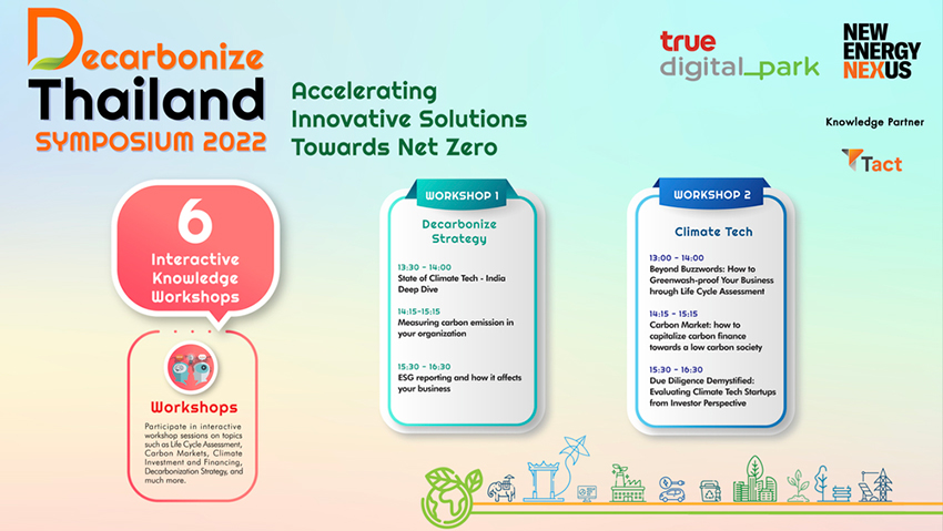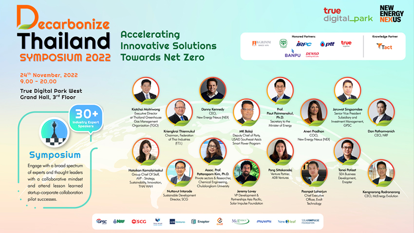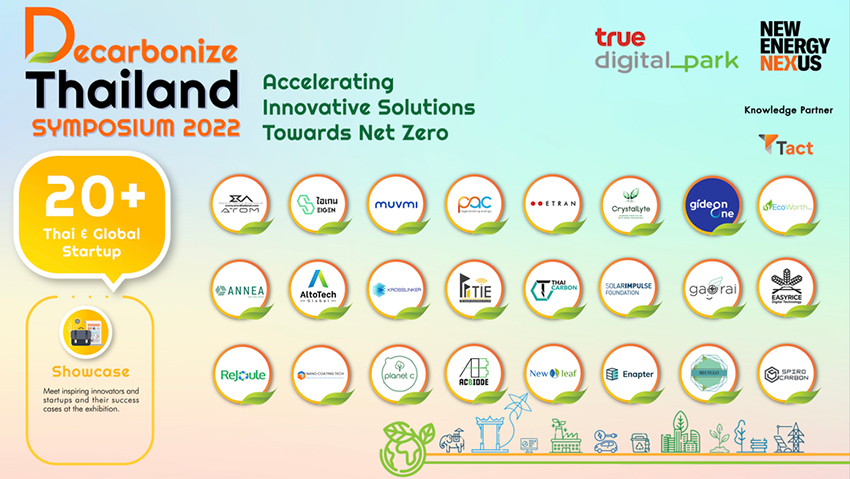 บริษัท ทรู ดิจิทัล พาร์ค จำกัด ร่วมกับ นิวเอนเนอร์จี้ เน็กซัส และพันธมิตร 8 องค์กรชั้นนำได้แก่ กลุ่ม บี.กริม, เครือเจริญโภคภัณฑ์, บมจ. ไออาร์พีซี, บมจ. ปตท., บมจ. ทรู คอร์ปอเรชั่น, บมจ. บ้านปู, บจ. เด็นโซ่ อินเตอร์เนชั่ลแนล เอเชีย และ บ. แทคท์ โซเชียล คอนซัลติ้ง ประกาศความพร้อมจัดงาน “DECARBONIZE THAILAND SYMPOSIUM 2022” อย่างยิ่งใหญ่ เร่งขับเคลื่อนโรดแมป เป้าหมายการปล่อยก๊าซเรือนกระจกสุทธิเป็นศูนย์ (Net-Zero) ภายในปี 2065 ตามนโยบายรัฐบาล โดยเป็นงานที่รวมพลังจากหน่วยงานทุกภาคส่วน ทั้งจากประเทศไทยและทั่วโลก เพื่อร่วมหาโซลูชั่นลดคาร์บอนที่ตอบโจทย์ภาคอุตสาหกรรม ตลอดจนการสร้างอุตสาหกรรมใหม่จากคาร์บอนเพื่อร่วมขับเคลื่อนเศรษฐกิจไทย (Thailand’s Zero Carbon Economy) ในระยะยาว ร่วมสร้างความยั่งยืนให้ภาคอุตสาหกรรมพลังงานของประเทศไทย