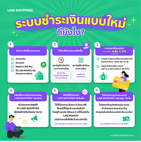 ระบบการชำระเงินแบบใหม่ คือ ระบบการจ่ายเงินรูปแบบใหม่สำหรับการซื้อสินค้าบน LINE SHOPPING ที่จะช่วยอำนวยความสะดวกในการจัดการยอดเงินให้ร้านค้า (Seller) เป็นระบบมากขึ้น พร้อมกับทำให้ร้านค้าได้รับเงินรวดเร็วขึ้น ส่งผลดีต่อสภาพคล่องของร้าน และเกิดการหมุนเวียนค่าใช้จ่ายได้ไวขึ้น รวมถึงทำให้ลูกค้า (Buyer) เลือกชำระเงินได้อย่างหลากหลายขึ้นตามความสะดวก การอัปเกรดระบบชำระเงินแบบใหม่ในครั้งนี้ ได้เพิ่มคุณสมบัติที่โดดเด่นดังต่อไปนี้