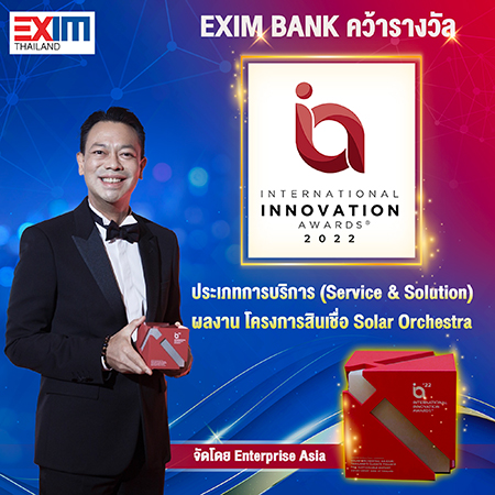 รับรางวัลประเภทการบริการ (Service & Solution) ผลงานโครงการสินเชื่อ Solar Orchestra จาก ดร.ฟง ชาน ออน ประธานที่ปรึกษาอาวุโส เอ็นเตอร์ไพรส์เอเชีย และนายวิลเลียม อึ้ง รองประธาน เอ็นเตอร์ไพรส์เอเชีย ในงานประกาศรางวัล International Innovation Award (IIA) 2022 ซึ่งจัดขึ้นเป็นปีที่ 6 โดย Enterprise Asia ถือเป็นรางวัลระดับภูมิภาคอันทรงคุณค่าที่มอบให้แก่องค์กรที่มีนวัตกรรมโดดเด่นและเป็นที่ยอมรับในด้านต่าง ๆ อาทิ ผลิตภัณฑ์ การบริการ องค์กรและวัฒนธรรม พร้อมเป็นวิทยากรแลกเปลี่ยนความคิดเห็นในการส่งเสริมนวัตกรรมองค์กรร่วมกับองค์กรชั้นนำ ณ โรงแรมเรเนซองส์ กรุงเทพฯ ราชประสงค์ เมื่อวันที่ 16 ธันวาคม 2565