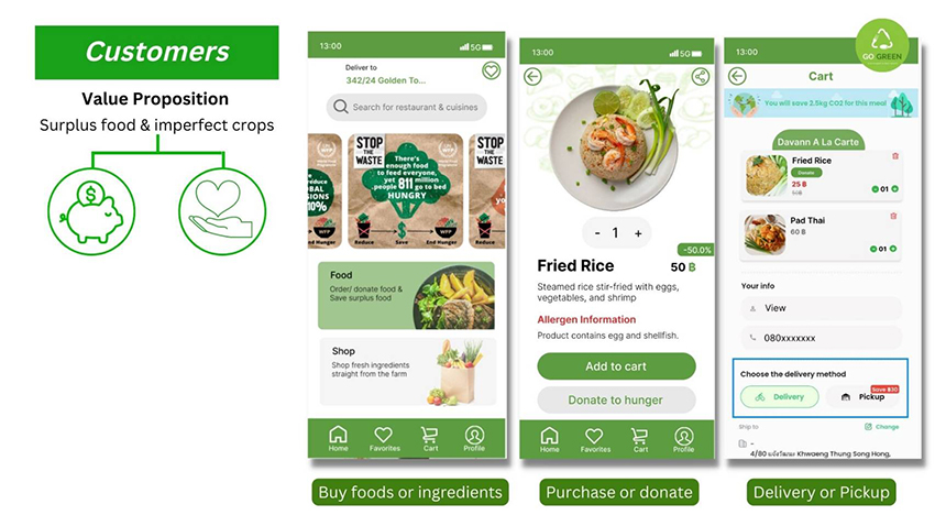 ขณะที่ผลงานชนะเลิศระดับมหาวิทยาลัย ตกเป็นของทีม Go Green ทีมที่เกิดจากการรวมตัวกันของนักศึกษาชาวไทย ชาวลาว และชาวกัมพูชา โดยนางสาวณัฏฐ์นรี สุขสมบูรณ์ นักศึกษาชั้นปีที่ 4 สาขาการจัดการธุรกิจการค้าสมัยใหม่ คณะวิทยาลัยนานาชาติ สถาบันการจัดการปัญญาภิวัฒน์ หนึ่งในสมาชิกทีม เล่าว่า ผลงานของทีมคือแอปพลิเคชัน Go Green แอปพลิเคชันซื้อขายอาหารและวัตถุดิบอาหาร เช่น กลุ่ม Imperfect Plant หรือผลผลิตทางการเกษตรที่รับประทานได้ แต่อาจมีรูปร่างหรือสีสันที่ไม่สวยงาม เช่น ผักที่มีรอยดำ จนไม่ผ่านการตรวจคุณภาพของห้าง โดยตัวแอปจะช่วยเชื่อมเกษตรกร ร้านอาหาร ลูกค้า ตลอดจนมูลนิธิที่จะนำอาหารไปบริจาคเข้าด้วยกัน ให้สามารถซื้ออาหารเหล่านั้นระหว่างกันได้ เพื่อช่วยลดปัญหาของเสียจากอาหาร (Food Waste)