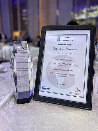 ดร.สมภพ ศักดิ์พันธ์พนม ประธานกรรมการ พร้อมด้วยนายสมศักดิ์ ศิริชัยนฤมิตร ประธานเจ้าหน้าที่บริหาร บริษัท แอสเซท โปร แมเนจเม้นท์ จำกัด รับรางวัลที่ปรึกษาด้านตลาดทุนที่ดีที่สุดในไทย (Thailand Best Equity Capital Market Advisory) ด้าน Financial Awards 2022 จากงาน The Global Economics Awards 2022 ซึ่งจัดขึ้นโดย The Global Economics นิตยสารด้านการเงินชั้นนำของสหราชอาณาจักร