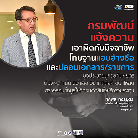 “จากประเด็นความเสียหายข้างต้นกรมฯ ได้ส่งเรื่องจากผู้เสียหายที่มีหลักฐานครบถ้วนถึงการกระทำผิดที่เกี่ยวกับกรมฯ ให้พนักงานสอบสวนดำเนินคดีอย่างถึงที่สุด ทั้งนี้ ขอเตือนภัยไปยังประชาชนและธุรกิจให้ใช้ความระมัดระวัง ไม่ประมาทหลงเชื่อคำเชิญชวนต่างๆ หากพลาดพลั้งไปแล้วขอให้นำหลักฐานไปแจ้งความกับพนักงานสอบสวนเพื่อช่วยกันหยุดการกระทำของมิจฉาชีพไม่ให้สร้างความเสียหายไปมากกว่านี้ และเมื่อจะทำธุรกรรมใดขอให้ตรวจสอบอย่างรอบคอบ ซึ่งกรมฯ มีบริการตรวจค้นข้อมูลนิติบุคคลผ่านระบบ DataWarehouse+ เป็นข้อมูลที่เชื่อถือได้ และการออกประกาศใดๆ ของกรมฯ ก็สามารถเข้าดูได้ที่ www.dbd.go.th อย่างไรก็ดี หากมีข้อสงสัยหรือสอบถามเพิ่มเติมเกี่ยวกับการให้บริการของกรมฯ สามารถติดต่อได้ที่สายด่วน 1570” อธิบดี กล่าวในท้ายที่สุด