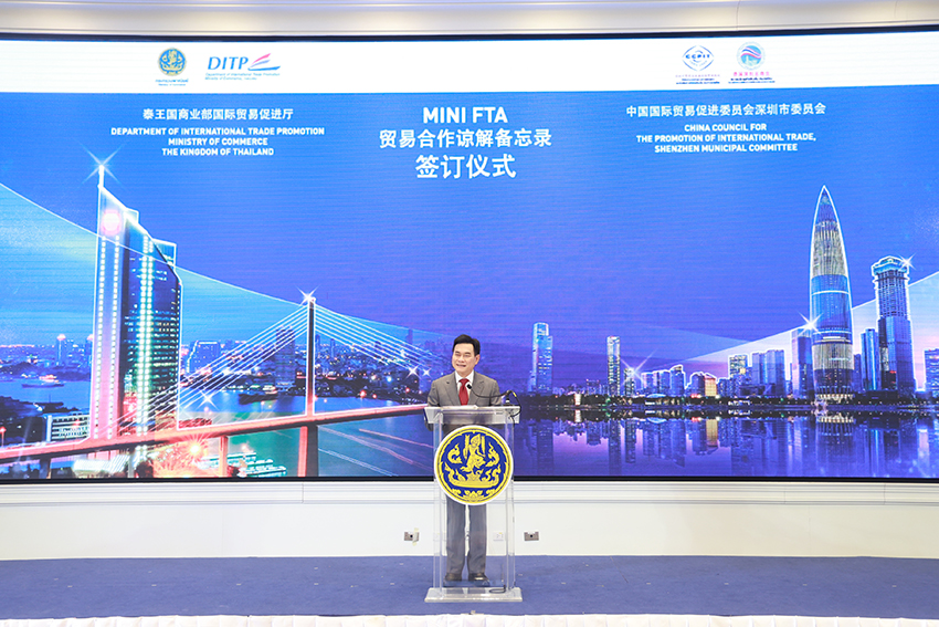 “ปี 2565 มูลค่าการค้าระหว่างไทยกับเซินเจิ้น มีมูลค่า 868,000 ล้านบาท ตั้งเป้าร่วมกันหลังมี mini FTA ภายใน 2 ปีที่ (2566-2567)จะทำให้มูลค่าการค้าระหว่างกันเพิ่มขึ้นอย่างน้อย 5% ตั้งเป้าเพิ่มอีก 43,000 ล้านบาท ในปี 66 และ 130,000 ล้านบาท ในปี 67 จะเป็นกลไกสำคัญเพิ่มมูลค่าการค้าการลงทุนอย่างเป็นรูปธรรม ผลักดันเศรษฐกิจของไทยและจีนให้เจริญก้าวหน้าสืบไป” รองนายกรัฐมนตรีและรัฐมนตรีว่าการกระทรวงพาณิชย์กล่าว