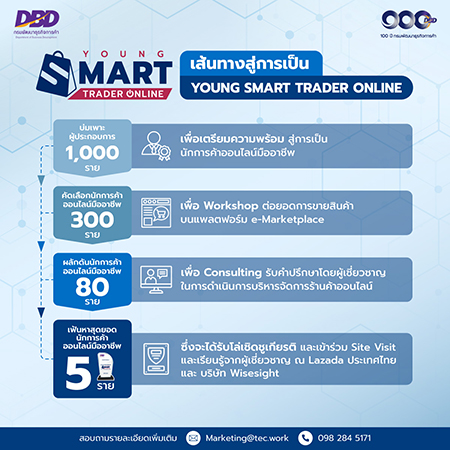 อธิบดี กล่าวต่อว่า “กรมพัฒนาธุรกิจการค้ามองเห็นถึงอุปสรรคในการทำธุรกิจให้ประสบความสำเร็จของเจ้าของธุรกิจกลุ่มนี้จึงได้จัด ‘กิจกรรมสร้างนักการค้าออนไลน์มืออาชีพ Young Smart Trader Online’ ขึ้น เพื่อพัฒนาทักษะผู้ประกอบการรุ่นใหม่ให้มีความรู้ด้านการค้าออนไลน์และก้าวสู่การเป็นนักการค้าออนไลน์มืออาชีพ โดยกิจกรรมฯ เริ่มต้นด้วยการเตรียมความพร้อมสู่การเป็นนักการค้ามืออาชีพจำนวน 1,000 รายทั่วประเทศ ด้วยการฟังบรรยายใน 2 หัวข้อหลักคือ 1) Starting Your Social Commerce Journey by Digital Mindset for Entrepreneur เรียนรู้การปรับตัวจากการทำตลาดแบบ Offline สู่ Online สร้างยอดขายที่มากขึ้น เข้าใจความหมายของการตลาด การสื่อสารบนโลกออนไลน์ และ 2) Landscape of Social Commerce and Why Social Commerce Is a Must for Entrepreneur ทำความรู้จักระบบ e-Marketplace และ Social Commerce Platform เทคนิคซื้อขายสินค้าบนช่องทางโซเชียลมีเดีย และกรณีศึกษาจากธุรกิจที่ประสบความสำเร็จ”