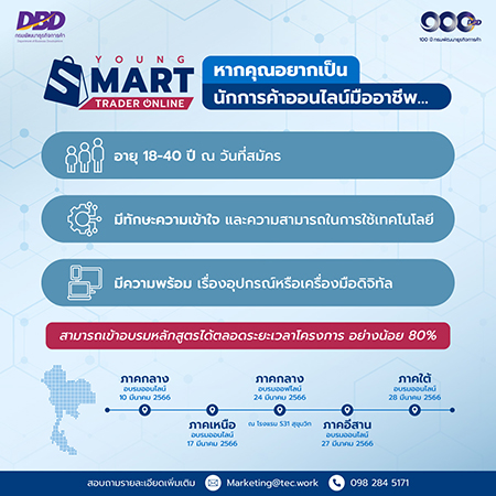 “โอกาสนี้ขอเชิญชวนนักธุรกิจรุ่นใหม่ที่มีอายุ 18-40 ปีเข้าร่วมกิจกรรม Young Smart Trader Online โดยไม่เสียค่าใช้จ่าย เปิดรับสมัครตั้งแต่วันนี้-9 มีนาคม 2566 ผ่านทาง www.dbd.go.th เลือกหัวข้อ อบรม/สัมมนา ทั้งนี้ กิจกรรมฯ มีกำหนดจัดครอบคลุมธุรกิจทั่วประเทศจำนวน 5 ครั้ง แบ่งเป็น รูปแบบออนไลน์ 4 ครั้ง ได้แก่ ภาคกลาง วันที่ 10 มีนาคม 2566, ภาคเหนือ วันที่ 17 มีนาคม 2566, ภาคอีสาน วันที่ 27 มีนาคม 2566 และ ภาคใต้ วันที่ 28 มีนาคม 2566 และกำหนดจัดแบบออฟไลน์ 1 ครั้ง ในวันที่ 24 มีนาคม 2566 ณ โรงแรม S31 สุขุมวิท กรุงเทพฯ สอบถามข้อมูลเพิ่มเติมได้ที่ กองพาณิชย์อิเล็กทรอนิกส์ หมายเลขโทรศัพท์ 02 547 5960” อธิบดี กล่าวทิ้งท้าย