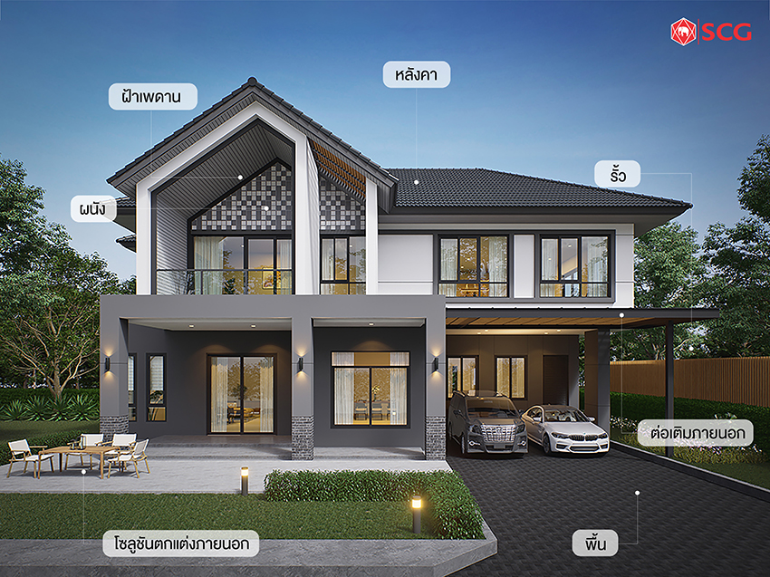 7) งานโซลูชันตกแต่งภายนอก ทั้ง โซลูชันงานฟาซาด (Façade Solution) ให้งานตกแต่งเปลือกอาคารเป็นเรื่องง่าย ตรงตามดีไซน์ที่ได้จินตนาการไว้ ด้วยวัสดุที่หลากหลายและทีมงานคุณภาพ และโซลูชันภูมิทัศน์ภายนอก (Outdoor Solution) บริการตกแต่งสวนรอบบ้านจาก เอสซีจี ช่วยให้การจัดสวนเป็นเรื่องง่ายขึ้น