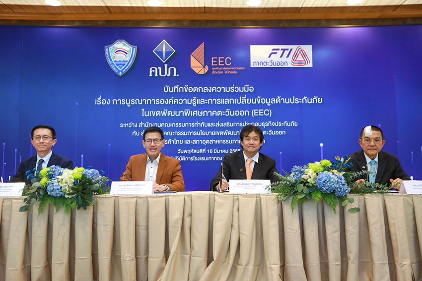 ดร.สุทธิพล ทวีชัยการ เลขาธิการคณะกรรมการกำกับและส่งเสริมการประกอบธุรกิจประกันภัย (เลขาธิการ คปภ.) พร้อมด้วย ดร.ธัชพล กาญจนกูล รองเลขาธิการคณะกรรมการนโยบายเขตพัฒนาพิเศษภาคตะวันออก ปฏิบัติการแทนเลขาธิการคณะกรรมการนโยบายเขตพัฒนาพิเศษภาคตะวันออก นายปรัชญา สมะลาภา รองประธานกรรมการและประธานคณะกรรมการพัฒนาเศรษฐกิจพื้นที่ภาคตะวันออก หอการค้าไทย ดร.สาโรจน์ วสุวานิช ประธานสภาอุตสาหกรรมภาคตะวันออก ร่วมลงนามในบันทึกข้อตกลงความร่วมมือ (MoU) เรื่องการบูรณาการองค์ความรู้และการแลกเปลี่ยนข้อมูลด้านประกันภัยในเขตพัฒนาพิเศษภาคตะวันออก (EEC) ระหว่าง 4 หน่วยงาน คือ สำนักงานคณะกรรมการกำกับและส่งเสริมการประกอบธุรกิจประกันภัย (สำนักงาน คปภ.) สำนักงานคณะกรรมการนโยบายเขตพัฒนาพิเศษภาคตะวันออก (สกพอ.) หอการค้าไทย และสภาอุตสาหกรรมภาคตะวันออก โดยได้รับเกียรติจาก นายนิติ วิวัฒน์วานิช รองผู้ว่าราชการจังหวัดชลบุรี คณะผู้บริหารระดับสูงของทั้ง 4 หน่วยงาน นายจีรพันธ์ อัศวะธนกุล รองประธานกรรมการหอการค้าไทย นายสุนทร ธัญญวัฒนกุล ประธานหอการค้ากลุ่มจังหวัดภาคตะวันออก 1 ประธานหอการค้าจังหวัด ประธานสภาอุตสาหกรรมจังหวัดในพื้นที่ EEC (ชลบุรี ระยอง และ ฉะเชิงเทรา) ผู้บริหารภาครัฐและเอกชน รวมถึงสื่อมวลชนร่วมเป็นสักขีพยาน ณ ศูนย์ปฏิบัติการโรงแรมเทาทอง มหาวิทยาลัยบูรพา อำเภอเมือง จังหวัดชลบุรี