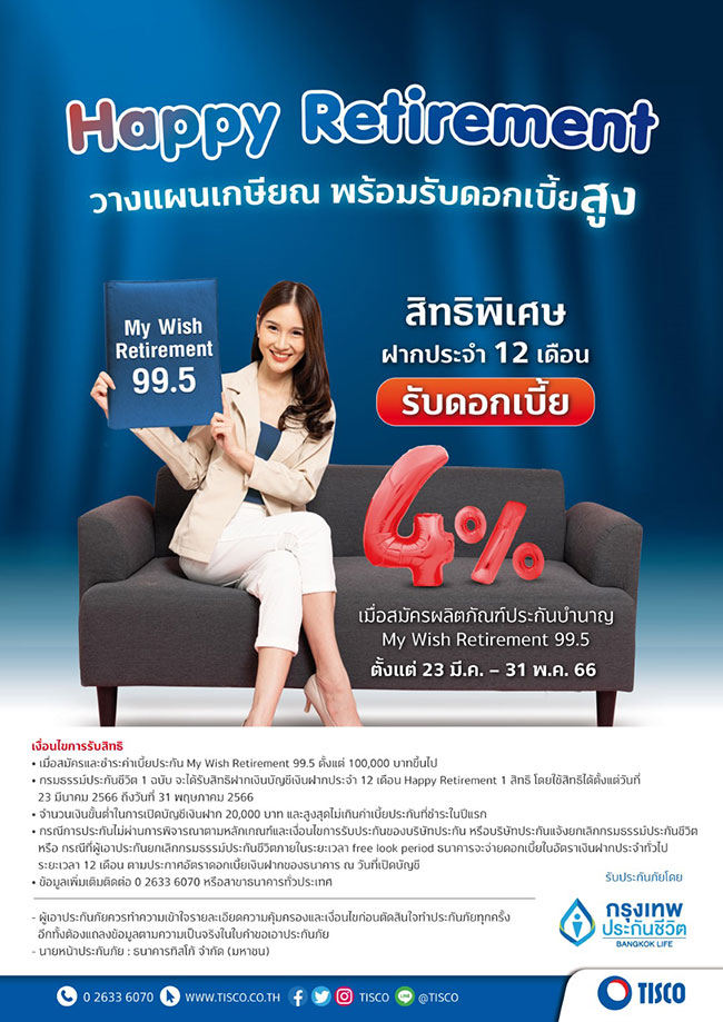 สำหรับลูกค้าที่สนใจประกันบำนาญ ‘My Wish Retirement’ คลิก https://link.tisco.co.th/2gzJsF หรือ สอบถามเพิ่มเติมหรือ สอบถามประกันภัยประเภทอื่นๆ ได้ที่ Contact Center 0-2633-6070 หรือ เว็บไซต์ www.tisco.co.th