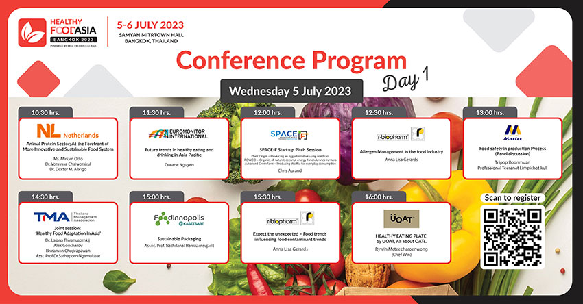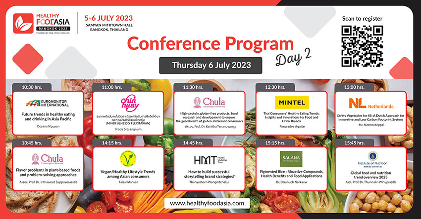 งาน Healthy Food Asia ขอนำเสนองานสัมมนาในหัวข้อที่น่าสนใจมากมาย โดยวิทยากรชั้นแนวหน้าจากนานาประเทศ เพื่อร่วมนำเสนอและแลกเปลี่ยนความรู้เกี่ยวกับผลิตภัณฑ์ แบรนด์ เทรนด์ และแนวโน้มทางธุรกิจที่น่าสนใจในอุตสาหกรรมอาหารเพื่อสุขภาพที่มีอัตราการเติบโตสูงอย่างต่อเนื่องในภูมิภาคนี้