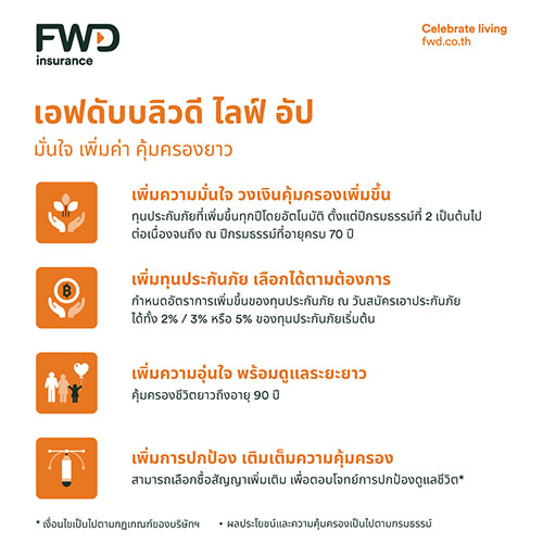 แบบประกัน “เอฟดับบลิวดี ไลฟ์ อัป” ประกันชีวิตที่เพิ่มความคุ้มครองชีวิตต่อเนื่องได้อย่างสะดวกสบาย โดยไม่ต้องซื้อกรมธรรม์ฉบับใหม่ สร้างหลักประกันที่สูงขึ้นในอนาคตให้แก่ครอบครัว