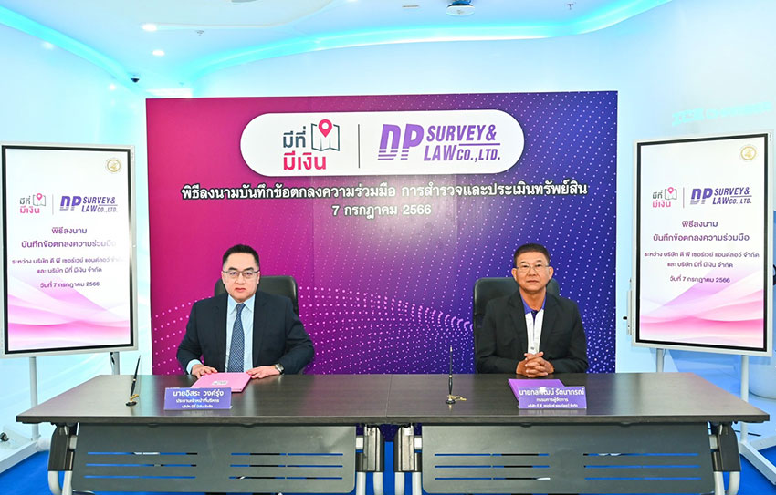 DP Survey บริษัทสำรวจภัย จับมือร่วมกับ บริษัท มีที่ มีเงิน จำกัด ผู้นำตลาดด้านการให้บริการสินเชื่อที่ดิน ร่วมลงนามบันทึกข้อตกลงความร่วมมือในการให้บริการสำรวจและประเมินราคาทรัพย์สินครอบคลุมพื้นที่ทุกจังหวัดทั่วประเทศ เพื่อประกอบการพิจารณาขอสินเชื่อ อำนวยความสะดวกรวดเร็ว และเสริมสร้างความมั่นใจในการพิจารณาการปล่อยสินเชื่อ ด้วยค่าธรรมเนียมให้บริการที่เป็นธรรมแก่ลูกค้า