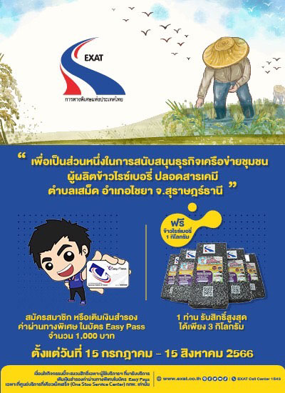 การทางพิเศษแห่งประเทศไทย ร่วมเป็นส่วนหนึ่งในการสนับสนุนธุรกิจเครือข่ายชุมชน จัดกิจกรรมสร้างสรรค์ เพียงสมัครสมาชิกหรือเติมเงินสำรองค่าผ่านทางในบัตร Easy Pass จำนวน 1,000 บาท รับทันที ข้าวไรซ์เบอร์รี่ ตั้งแต่วันนี้ จนถึง 15 ส.ค. 66 , วันที่ 16 ส.ค. - 15 ก.ย 66 รับกระเป๋าผ้ามัดย้อม และ วันที่ 16 ก.ย. - 15 ต.ค. 66 รับกระเป๋ากระจูด ที่จุดบริการที่เดียวเบ็ดเสร็จ (One Stop Service Center) ณ การทางพิเศษแห่งประเทศไทย