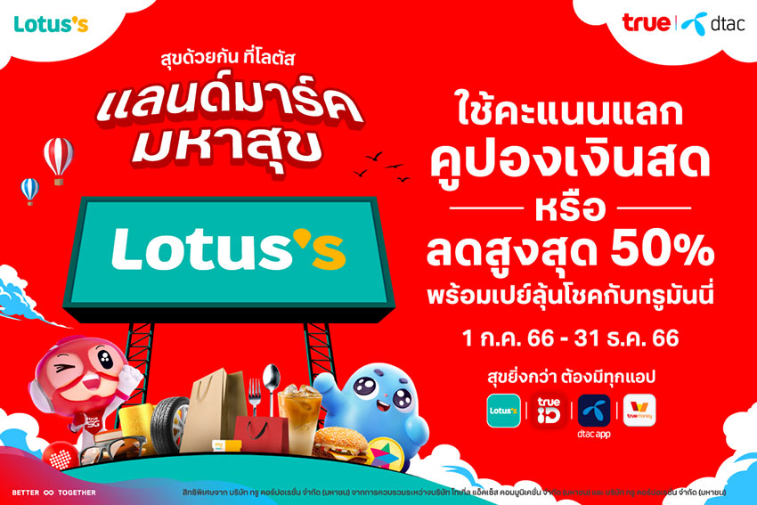 ลูกค้าทรู-ลูกค้าแบรนด์ดีแทค รับสิทธิประโยชน์ดีๆ อีกมากมาย พร้อมเตรียมพบกับโปรโมชั่นถูกซ้อนถูกประจำเดือนกันยายน โดยรับสิทธิ์ผ่านแอปทรูมันนี่ ลูกค้าทรูและลูกค้าแบรนด์ดีแทคดาวน์โหลดแอปรอได้เลย จะยกขบวนความคุ้มค่าสุดพิเศษมาให้ช้อปแบบจัดเต็ม ในซูปเปอร์มาร์เก็ตที่โลตัสและโลตัสโกเฟรชทุกสาขาทั่วประเทศใกล้บ้านคุณ หรือ ลูกค้าทรู ดูรายละเอียดเพิ่มเติมได้ที่ https://privilege.trueid.net/th/articles/A8EKAK7nmMxN ลูกค้าแบรนด์ดีแทคดูสิทธิพิเศษเพิ่มเติมที่ https://dtacapp.onelink.me/I2fL/ihdjsfh9